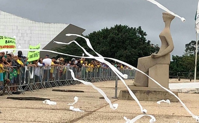 Em Brasília, os manifestantes atiraram rolos de papel higiênico no prédio do STF, enquanto gritavam “lixo” e cantavam “STF, preste atenção, a sua toga vai virar pano de chão”.