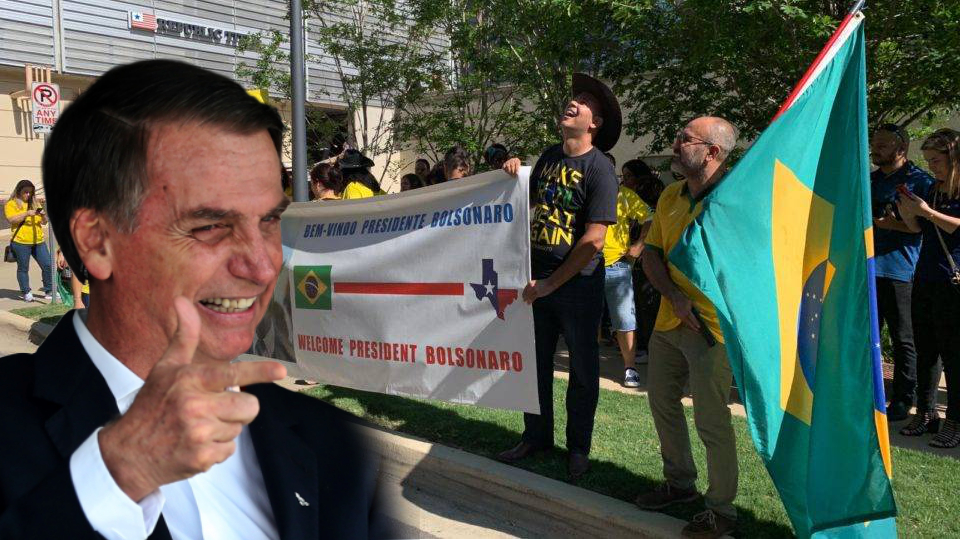Uma manifestação com brasileiros recepcionou o presidente Jair Bolsonaro no Texas, estado americano.