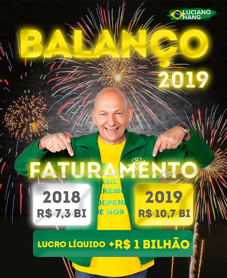Ontem fechamos o balanço anual do grupo Havan. Crescemos mais de 45%, passando dos R$ 10 bilhões de faturamento e ultrapassando R$ 1 bilhão de lucro líquido. Na Havan trabalhamos com metas e objetivos bem definidos. Por isso conseguimos ir, a cada ano, ainda mais longe. Superamos nossa meta que era de 35% e eu prometi que se isso fosse feito nossos colaboradores ganhariam 100% do PPR (Programa de Participação de Resultados), ou seja, mais um salário cheio no ano. O décimo quarto. Sonhamos alto e só conseguimos vencer os desafios porque temos colaboradores que trabalham em equipe e vestem a camisa da Havan. Para vocês, meu muito obrigado. Que venha 2020. Vamos correr!