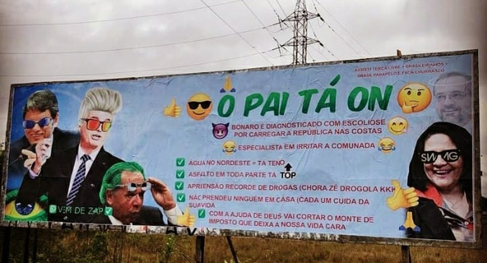 Instalado em em Goiânia, a placa traz fotos de ministros trajados de memes e heróis com mensagem “o pai tá on”.